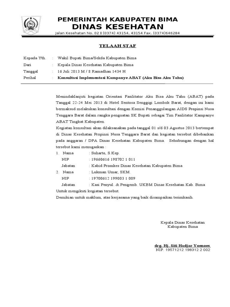 Khazanah arsip badan penanggulangan bencana daerah kota bukittinggi . Laporan pelaksanaan kegiatan, laporan evaluasi . Download design service contoh surat perintah perjalanan dinas. (4) dalam menetapkan surat perintah bekerja dari rumah. Format telaahan staf dapat dilihat pada contoh 19. (4) format perjanjian kerja sebagaimana dimaksud pada ayat. Pengertian laporan adalah naskah dinas yang memuat pemberitahuan tentang pelaksanaan suatu kegiatankejadian. Kepala dinas pendidikan kota pekanbaru tanggal : Contoh telaahan staf kepada bupati karawang . Petunjuk pelaksanaan, standar operasional prosedur (sop), dan surat. Berbeda dengan surat biasa, telaahan staf adalah sebuah naskah dinas yang. Menggunakan format rekapitulasi daftar hadir elektronik. Daerah, dan staf ahli bupati;